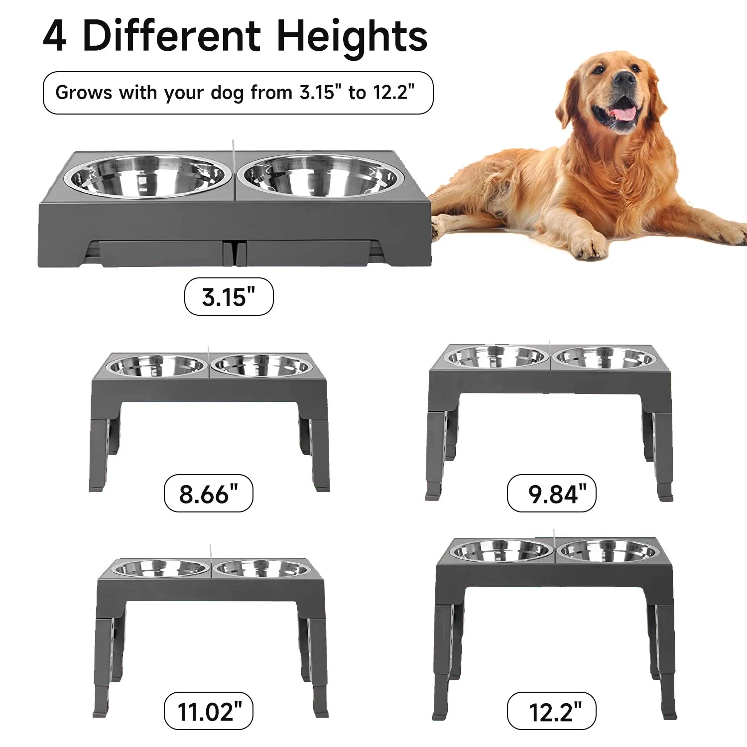 Suitable for all stages of life: The elevated dog bowls can be adjusted to 5 different heights to suit all life stages, growing with your puppy. Adjust the height by pushing the 4 buttons on the table legs to 8 cm for small puppies and cats, 22 cm and 25 cm for medium to large dogs, and 28 cm and 31 cm for large breed dogs.
