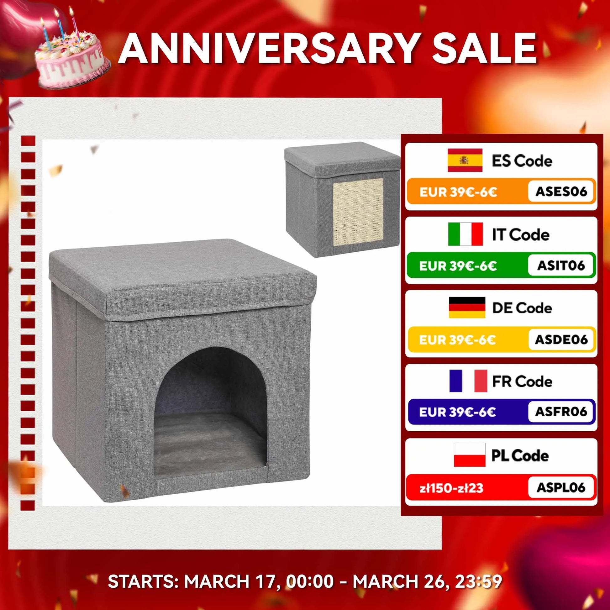 Esta moderna y encantadora casa para gatos PawHut ofrece a tu mascota un pequeño refugio donde esconderse, jugar, observar y descansar. Con una puerta principal, una alfombra rascadora y una cubierta extraíble, tu gato disfrutará de un espacio excelente para relajarse y echarse una siesta. Fácil de plegar, esta cama para gatos es ideal para viajar y se puede guardar fácilmente en un rincón de la habitación o cuando no se usa.